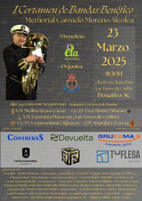 Y es que el auditorio municipal Juan Baño albergará la celebración del I Certamen Benéfico de Bandas -Memorial Carmelo Moreno Alcolea, organizado a beneficio de ELA Región de Murcia por el Cabildo Superior de Cofradías del municipio en colaboración con la Concejalía de Cultura.