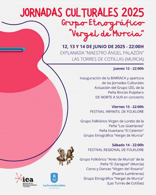 Del 12 al 14 de junio, todos los días a las 22:00 horas, la explanada Maestro Ángel Palazón será el escenario de las Jornadas Culturales 2025 del grupo etnográfico "Vergel de Murcia", que cuentan con la colaboración de la Concejalía de Cultura. "Tenemos muchas ganas de que llegue un año más esta cita con nuestras tradiciones, que promete para toda la familia música, baile, buena gastronomía y raíces huertanas", explica el alcalde Pedro José Noguera.