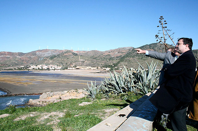 El consejero de Obras Públicas y Ordenación del Territorio, José Ballesta, visitó hoy la Bahía de Portmán acompañado del alcalde de La Unión, Francisco Bernabé, y presentó el avance del proyecto del nuevo puerto que está previsto que se construya tras la regeneración de la zona.