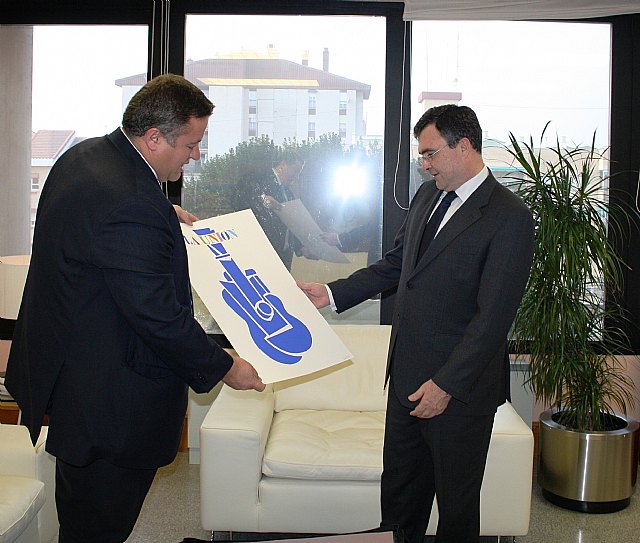 El consejero de Obras Públicas y Ordenación del Territorio, José Ballesta, recibió hoy de manos del alcalde de La Unión, Francisco Bernabé, un ejemplar del cartel del Festival Internacional del Cante de las Minas, realizada por el prestigioso pintor Manolo Valdés para promocionar esta cita de referencia del flamenco mundial que acoge cada mes de agosto la Catedral del Cante de La Unión.