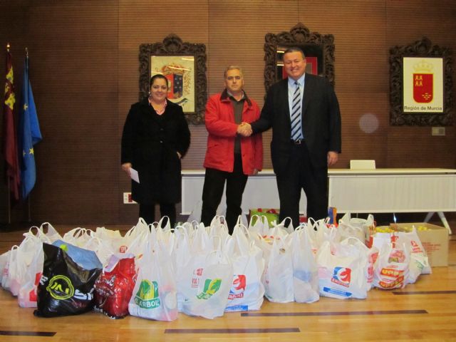 El presidente de Cáritas en La Unión, Gregorio Ruiz, ha sido el encargado de supervisar y recoger el depósito de alimentos realizado por los funcionarios y cargos del Ayuntamiento, al tiempo que ha recibido, de manos de la concejala de Festejos, María Hermógenes, el dinero que se ha recaudado con fines solidarios en el Mercadillo Navideño.