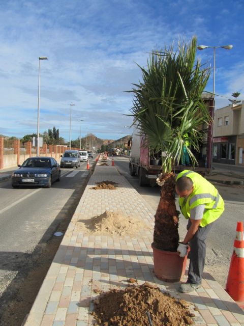 La Unión, 11 de enero de 2011. Las obras remodelación de la Avenida del Mediterráneo de La Unión, que se encuentra frente a las barriadas de Sierra Minera y de Santa Bárbara, avanzan a buen ritmo y se preparan para llegar a su fase final, puesto que ya han comenzado a llegar las palmeras que servirán para embellecer la mediana divisoria de esta infraestructura.