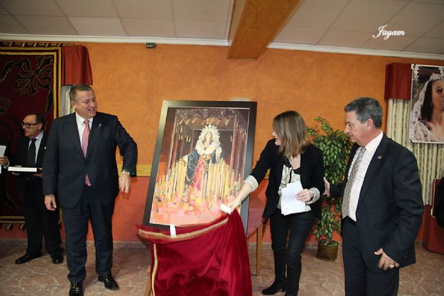A continuación, la joven artista Mar Hernández, hija de nuestro querido paisano el pintor Francisco Hernández Cop, descubrió la extraordinaria obra pictórica que ha realizado para convertirse en el cartel anunciador de esta Semana Santa y que reproduce sobre un lienzo una bella imagen de la Virgen Dolorosa en su trono.