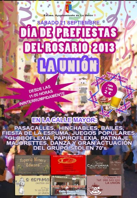 La calle Mayor de La Unión se convertirá mañana sábado día 21, a partir de las 11:00 horas de la mañana, en una Gran Recinto Festivo con ocasión de la celebración de la "I Jornada de Prefiestas del Rosario 2013".