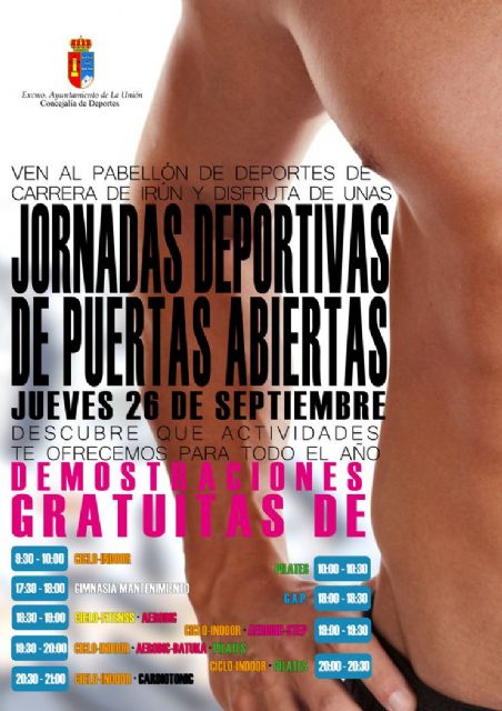 La Concejalía de Deportes del Ayuntamiento de La Unión, dirigida por la Concejal Laura Vicente, ha organizado unas jornadas deportivas de puertas abiertas para este jueves 26 de septiembre, en horario de 9:00 horas a 21:00 horas, en el Pabellón de Deportes de la Carrera de Irún, donde se darán a conocer a los ciudadanos que estén interesados en el deporte del municipio, todas las actividades que se ofrecen para todo el año desde las diversas instalaciones deportivas municipales.