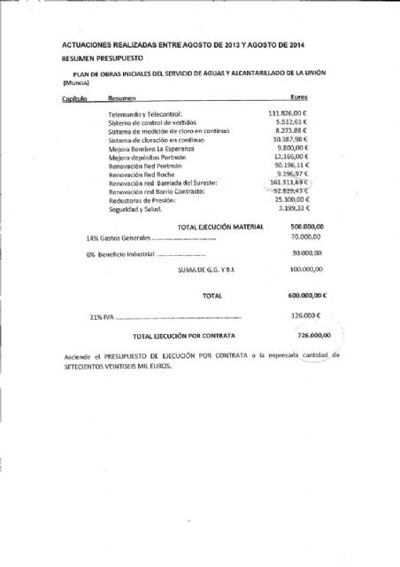 En el segundo año de vigencia del contrato, es decir, entre agosto de 2013 y agosto de 2014, las actuaciones que se están ejecutando ascienden a 726.000 euros, habiéndose finalizado recientemente diversas obras en Portmán y teniendo previsto en breve acometer la renovación integral de la Barriada del Sureste en La Unión.