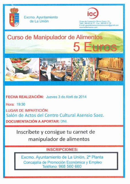 El próximo día 3 de abril tendrá lugar una nueva edición del curso para la obtención del Carnet de Manipulador de Alimentos. Este curso tendrá lugar en el Centro Cultural Asensio Sáez a partir de las 19:30 horas. El coste del curso será de 5 euros y tendrá una validez de un año el carnet que se extiende.