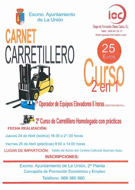 Además, los días 24 y 25 de abril se realizará un Curso doble de "Operador de aparatos elevadores" y de "Carretillero homologado con prácticas". Este curso se realizará en el Centro Cultural Asensio Sáez el jueves 24 de 16:30h. a 21:30 horas y el viernes 25 de 9:00h. a 14:00 horas. Este doble Curso tendrá un coste de 25 euros.