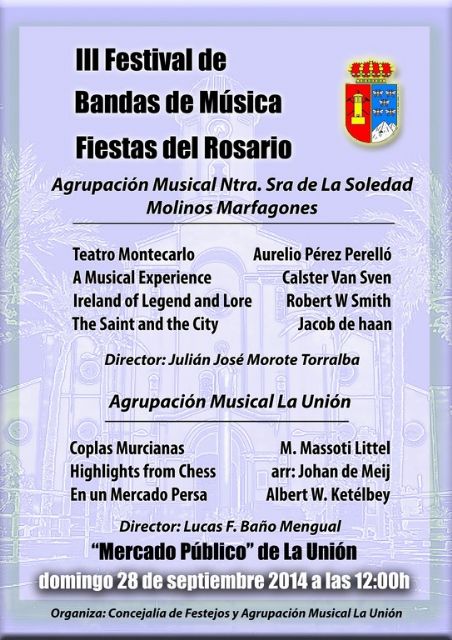 La Banda de La Unión, dirigida por Lucas Baño Mengual, interpretará las piezas Coplas Murcianas, de M. Massoti Littel; Highlights from Chess, de Johan de Meij; y En un Mercado Persa, de Albert W. Ketélbey.