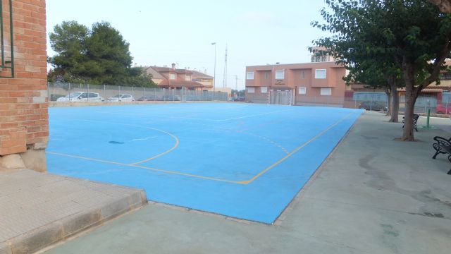 Igualmente, en el exterior del recinto también se ha actuado, nivelando la zona existente del depósito de gasoil; además se ha intervenido sobre la pista deportiva, tapando grietas y con limpieza y pintado de la misma con señalización de juegos. Se ha actuado en el tramo de paso con hormigón fratasado para acceso desde el patio a la zona de aula y vestuarios del Pabellón de planta baja colindante con la calle Isabel la Católica.
