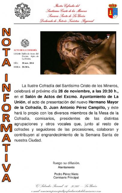 La Ilustre Cofradía del Santísimo Cristo de los Mineros, celebrará el próximo día 28 de noviembre, a las 20.30 horas, en el Salón de Actos del Excmo. Ayuntamiento de La Unión, el acto de presentación del nuevo Hermano Mayor de la Cofradía, D. Juan Antonio Pérez Campillo, y éste hará lo propio con los diversos miembros de la Mesa de la Cofradía, comisarios, presidentes de las distintas agrupaciones y otros vocales que, junto al resto de cofrades y seguidores de las procesiones, colaboran y contribuyen al engrandecimiento de la Semana Santa de nuestra ciudad.