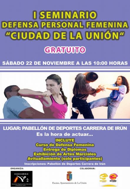 La Asociación Española de Artes Marciales y Disciplinas Cardio Deportivas (ASEAM-DC) ha organizado para este próximo sábado día 22 de noviembre, a partir de las 10:00 horas, en el Pabellón Polideportivo de Carrera de Irún, el primer Seminario de defensa personal femenina "Ciudad de La Unión", impartido por el Sensei Pedro Miranda, todo ello en colaboración con las Concejalías de Deportes y de Mujer del Ayuntamiento de La Unión, dirigidas por Laura Vicente y Rosa Pagán, respectivamente.