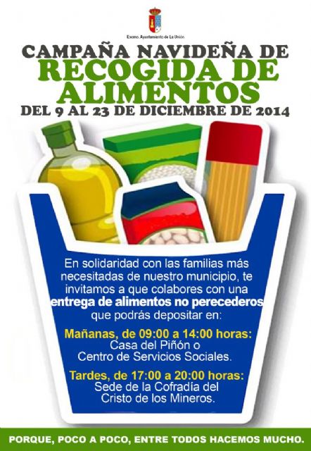 La Concejalía de Política Social del Ayuntamiento de La Unión, que dirige Rosa Pagán, ha puesto en marcha un año más su tradicional Campaña Solidaria para la Recogida de Alimentos No Perecederos de cara a la próxima Navidad.