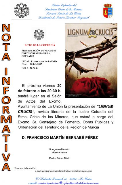 El acto tendrá lugar a las 20.30 horas y se invita a los unionenses y amantes de nuestra Semana Santa Minera a estar presente en otro de los actos importantes de nuestra Semana Santa Minera.