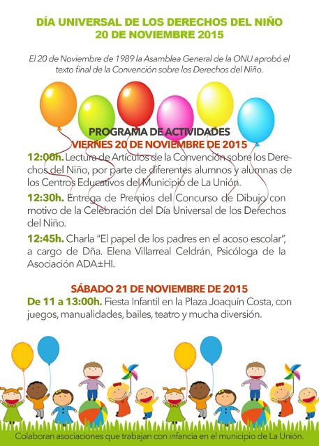 El Ayuntamiento de La Unión, a través de su Concejalía de Educación y Cultura celebra el Día del Niño con un programa de actividades para los días 20 y 21 de Noviembre.
