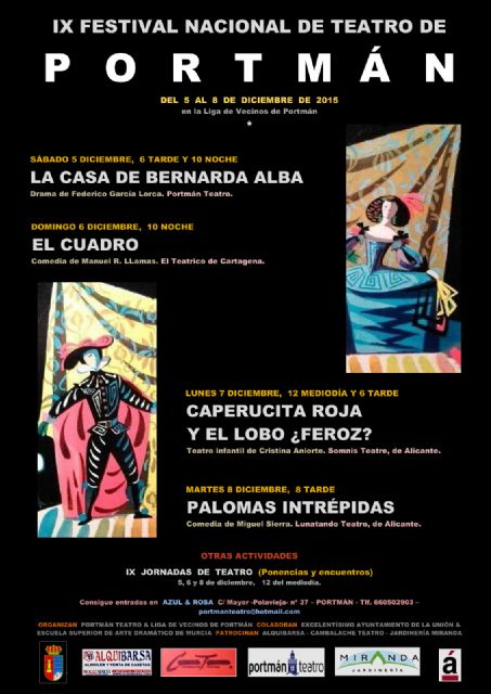 La Asociación Cultural "Portman Teatro", presidida por el actor unionense Francisco García Vicente, inaugurará el próximo 5 de Diciembre, el IX Festival Nacional de Teatro de Portman con la representación de la obra "La casa de Bernarda Alba".