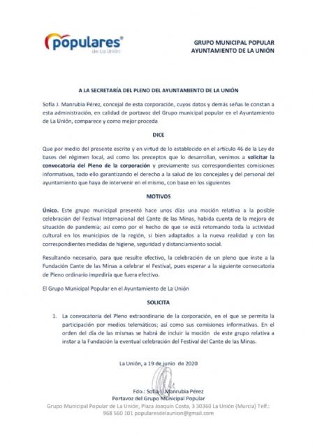 Conforme a lo que se ha aprobado en la mañana de hoy en el Consejo de Gobierno de la Comunidad Autónoma de la Región de Murcia con respecto a la limitación a 500 personas en la celebración espectáculos culturales al aire libre, hemos solicitado la convocatoria de un Pleno extraordinario para el debate de la moción presentada la semana pasada sobre la celebración de la LXI Edición del Festival Internacional del Cante de las Minas, solo con los concursos de cante y guitarra.