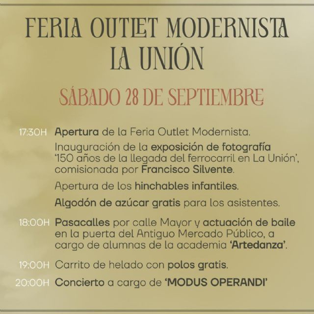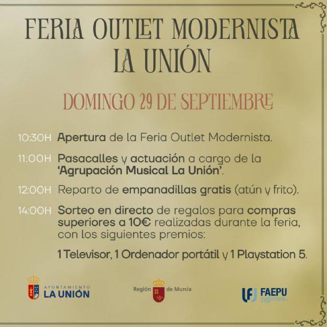 El alcalde ha presentado hoy la Feria Outlet Modernista 2024, que tendrá lugar durante el fin de semana del 28 y 29 de septiembre. Le ha acompañado el presidente de FAEPU, Carlos Bernabé, y cuenta también con la colaboración de la Dirección General de Comercio de la Comunidad Autónoma de Murcia.