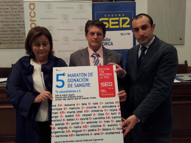 El Alcalde de Lorca, Francisco Jódar, y el director de Radio Lorca-Cadena Ser, Antonio Rosa, han presentado esta mañana el V Maratón de Donación de Sangre 'Ser Solidarios', que promovido por esta emisora con el apoyo del Ayuntamiento, se celebrará este jueves 5 de diciembre en el Aula de Cultura de Caja Murcia, ubicado en la esquina de la calle Pío XII con Corredera.