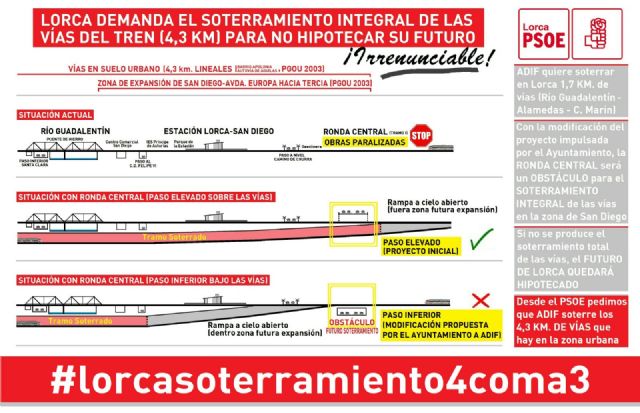 Romera insiste en que Lorca necesita que el soterramiento sea integral en los 4,3 kilómetros de vías que hay entre el Barrio Apolonia y la conexión con la Autovía de Águilas (RM-11), que es el área que el vigente Plan General de Ordenación Urbana planifica como futuras zonas urbanizables y de expansión de la ciudad.