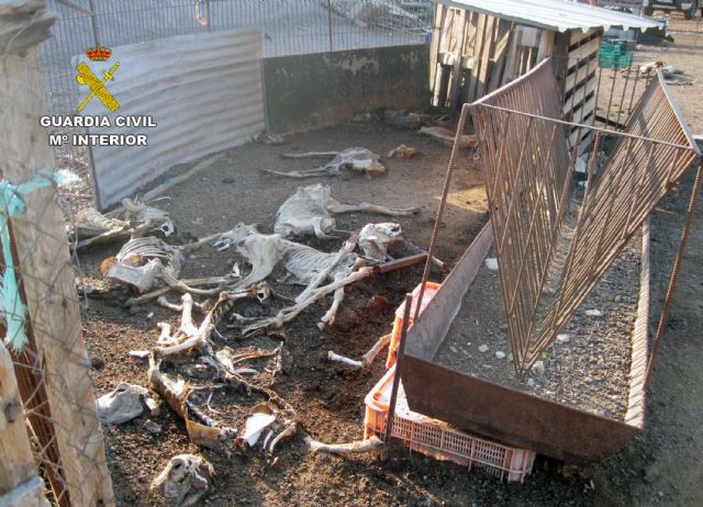 La Guardia Civil de la Región de Murcia, en colaboración con veterinarios de la Dirección General de Agricultura, Ganadería, Pesca y Acuicultura (Oficina Comarcal Agraria de Lorca) y gracias a la colaboración ciudadana, ha desarrollado una investigación que ha permitido el hallazgo de una treintena de cadáveres de ganado ovino y caprino diseminados en una explotación ganadera, sita en el término municipal de Lorca, así como de cerca de un centenar de animales vivos desnutridos y en pésimas condiciones de salubridad.