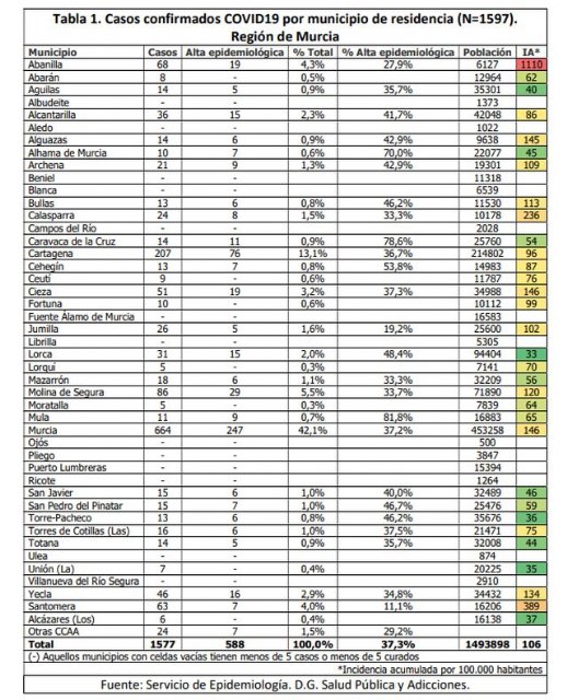 En la Región de Murcia hasta la fecha del informe se han registrado 1625 casos confirmados de infección por COVID-19.