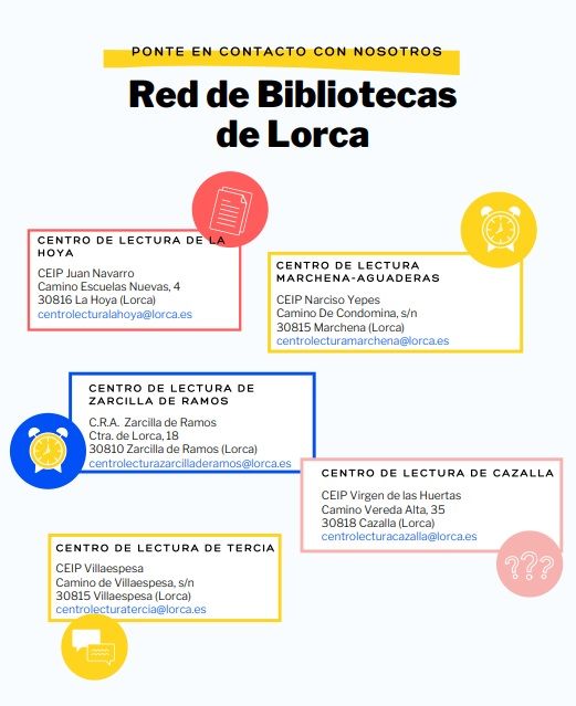 La concejal de Educación ha recordado que "el horario del mes de julio de las bibliotecas 'Pilar Barnés' y la Infantil y Juvenil es de 8 a 14 y de 16 a 21 horas y en las bibliotecas de La Paca, Almendricos y Zarcilla de Ramos será de martes a jueves, de 17 a 20 horas y en las bibliotecas de Purias, IES Príncipe de Asturias, La Hoya, Marchena-Aguaderas, Cazalla y Tercia será de martes a jueves, de 10:30 a 13:30 horas, permaneciendo cerradas durante el próximo mes de agosto".