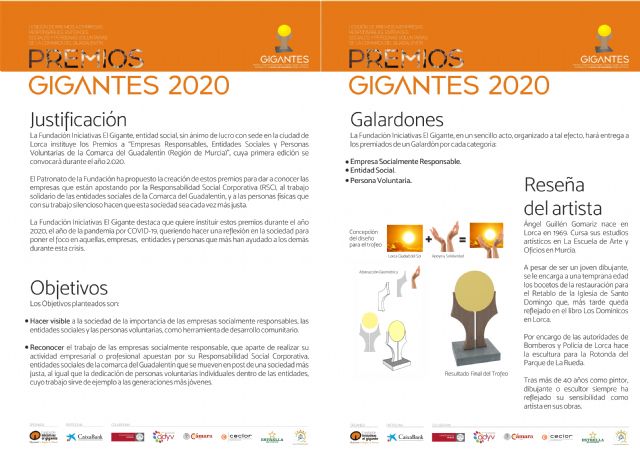 Una veintena de organizaciones, entidades y personas han concurrido a la primera edición de los Premios Gigantes 2020 de la Fundación Iniciativas el Gigante. El plazo de presentación de candidaturas se cerró anoche a las doce horas. Unos instantes antes llegaban las últimas propuestas para hacerse con los galardones que pretenden destacar la labor de empresas responsables, entidades sociales y personas voluntarias de la Comarca del Guadalentín. El presidente de la Fundación Iniciativas el Gigante, Francisco Perán Albarracín, ha afirmado que los premios son necesarios para "hacer visible a la sociedad de la importancia de las empresas socialmente responsables, las entidades sociales y las personas voluntarias, como herramienta de desarrollo comunitario".