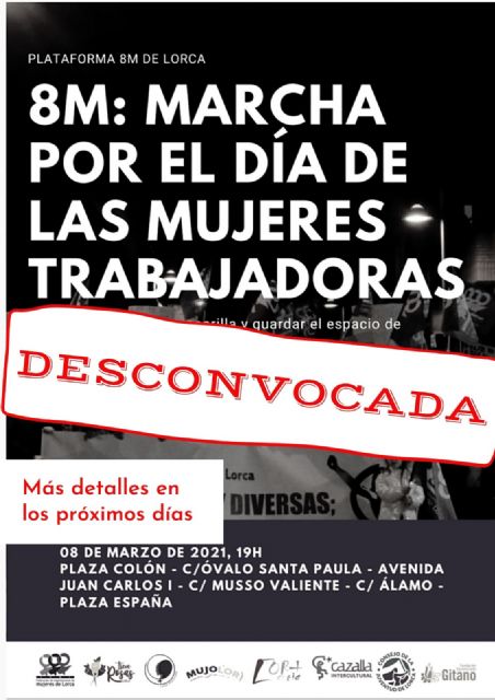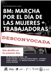 A pesar de haber recibido la autorización de la Delegación de Gobierno, desde la Plataforma 8M de Lorca hemos tomado la decisión de desconvocar la manifestación que teníamos prevista realizar el lunes 8 de Marzo, día Internacional de los Derechos de la Mujer. En lugar de la manifestación, proponemos una actividad que persigue los mismos objetivos y que nos permitirá conmemorar el 8M desde casa, acorde con los recursos humanos y financieros de los que disponemos.