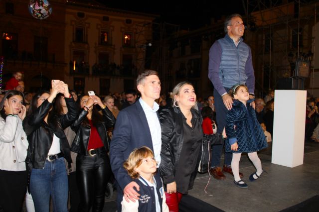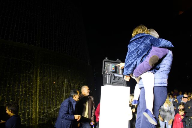 La pequeña Triana y el alcalde, Fulgencio Gil Jódar, pulsaban el botón con el que se encendían los arcos, guirnaldas y árboles de Navidad de la ciudad, los barrios y las pedanías.