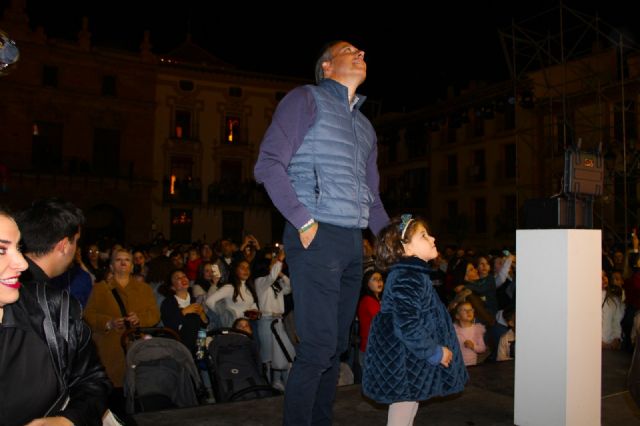 La Plaza de España ha reunido este sábado a más de 7.500 personas que han participado del encendido de la iluminación extraordinaria de Navidad. El 'corazón' del casco antiguo de la Ciudad aparecía repleto de público, pero también calles aledañas como Álamo, Santiago, Corregidor y Selgas. Otros aprovechaban la apertura del Carrerón de la antigua Colegial de San Patricio para situarse en un lugar privilegiado, como también lo hacían decenas de vecinos que llenaban los balcones de sus viviendas. "Este domingo comienza el Adviento. Queríamos que en ese día de inicio del tiempo de Navidad nuestra ciudad, barrios y pedanías mostraran la iluminación navideña", ha dicho el alcalde, Fulgencio Gil Jódar, quien tenía un recuerdo para los afectados por la Dana. "Cada una de esas pequeñas bombillas que este sábado hemos encendido, queremos que sea un abrazo, una sonrisa, para nuestros hermanos de Valencia". La Navidad, ha dicho, "es un canto de esperanza. Es la luz en la oscuridad. Es una época mágica en la que las miradas de los niños muestran inocencia e ilusión. Lo que podemos encontrar en la carita de Triana que esta noche ha sido la encargada de pulsar con fuerza ese botón que nos ha ayudado a encender de Navidad Lorca". Y ha concluido: "Esta noche una nueva estrella brilla en el cielo, la del árbol de la Plaza de España, que deseo nos ilumine a todos como lo hace la sonrisa de Triana. A todos, Felices Fiestas". Tras pulsar el botón se encendía el gigantesco árbol de Navidad de la Plaza de España. En ese instante un impresionante castillo de fuegos artificiales era lanzado desde la parte de atrás de la Casa Consistorial iluminando todo el cielo del casco antiguo de la Ciudad. Y se escuchaban los primeros cánticos navideños de manos de el actor y cantante español, Daniel Diges, que representó a España en el Festival de Eurovisión en 2010 y que ha protagonizado musicales como 'High School Musical', 'Mamma Mia', 'Los Miserables', 'La Bella y la Bestia' y 'Hoy no me puedo levantar'. Cantaba desde lo más alto del Carrerón de la antigua Colegial de San Patricio. A su término, el público recorría las principales calles para contemplar la iluminación extraordinaria de Navidad que protagonizaba cientos de instantáneas.