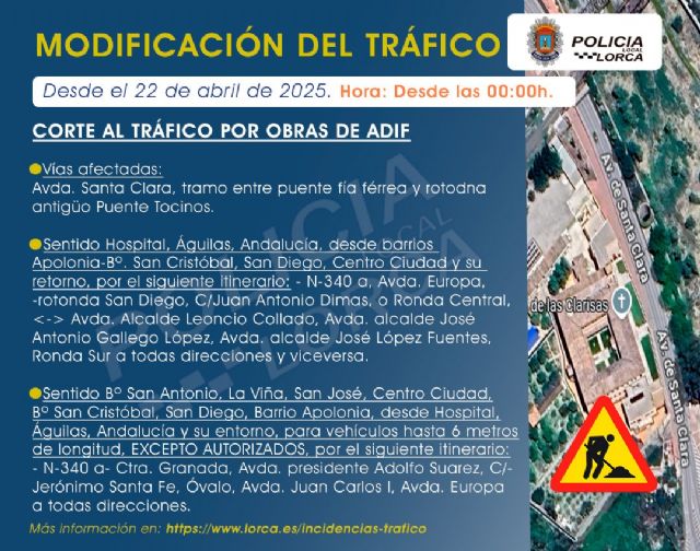 Con motivo del avance de las obras del Corredor Mediterráneo de Alta Velocidad, ADIF ha solicitado al Ayuntamiento el corte total al tráfico rodado en la Avenida Santa Clara, en el tramo comprendido entre el Puente de la Vía Férrea y la rotonda del antiguo Puente Tocinos. Así lo han anunciado este lunes los ediles de Infraestructuras y Seguridad Ciudadana del Ayuntamiento de Lorca, Ángel Meca Ruzafa y Juan Miguel Bayonas, respectivamente, quienes también han informado que este corte de tráfico estará vigente desde el martes, 22 de abril. Además, es importante destacar que se mantiene el tránsito peatonal y se prohibirá el estacionamiento en la zona desde las 00:00 horas de este mismo día.