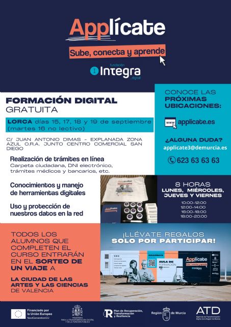 El concejal de Nuevas Tecnologías del Ayuntamiento de Lorca, Antonio David Sánchez, ha anunciado que el aula de formación itinerante de la campaña "Applícate: Sube, conecta y aprende", promovida por la Fundación Integra Digital y el Gobierno de la Región de Murcia, con la colaboración en nuestro municipio del Ayuntamiento de Lorca, visitará de nuevo nuestra ciudad, en esta ocasión los días 22 y 23 de diciembre, para formar gratuitamente a la ciudadanía en el uso de los dispositivos móviles y nuevas tecnologías.