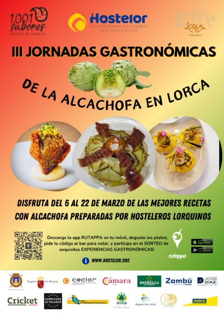 La Asociación Profesional de Hosteleros de Lorca; Hostelor, organiza desde el próximo viernes 6 al 22 de marzo las III Jornadas Gastronómicas de la alcachofa en Lorca, con la participación de una veintena de establecimientos asociados, y con el objetivo principal de seguir impulsando la creatividad y calidad gastronómica y desestacionalizando la actividad social de Lorca, y atraer a vecinos y visitantes a consumir y a disfrutar en bares y restaurantes de la localidad. Además, la iniciativa trata de fomentar y potenciar el consumo de alcachofa, y apoyar a los agricultores y productores locales. Se trata de un producto de gran relevancia en el sector primario local y regional, siendo la Región de Murcia la mayor productora en el territorio nacional. Más del 60% de la superficie de cultivo de alcachofa que hay en la Región se encuentra en la comarca del Guadalentín. En concreto, Lorca, con 3000 hectáreas de cultivo, es el municipio que lidera estas cifras.