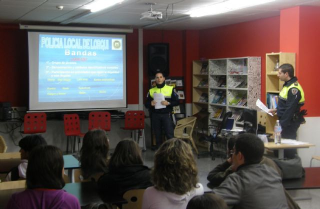 Los cerca de 400 alumnos del IES "Romano García" de Lorquí asistieron a las charlas "Convivencia y mejora de la seguridad escolar" que fueron impartidas recientemente por agentes de la Policía Local del municipio en el propio centro docente. Esta propuesta, que contó con un total de nueve charlas, se realizó en horario escolar y en ella se trataron temas tan importantes para el entorno escolar, y sobre el mismo, como "La agresividad y el 'bullying' o acoso escolar" o "Las drogas, las bandas e Internet".