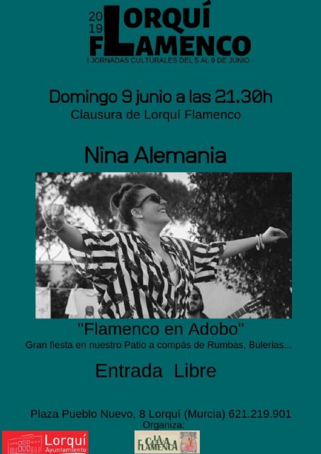 Cerrará estas primeras jornadas, el domingo 9, una gran fiesta flamenca a ritmo de rumba y bulerías en el patio de la Cueva Flamenca de Lorquí a cargo de Nina Alemania y su 'Flamenco en adobo', a las 21.30 horas y con entrada libre.
