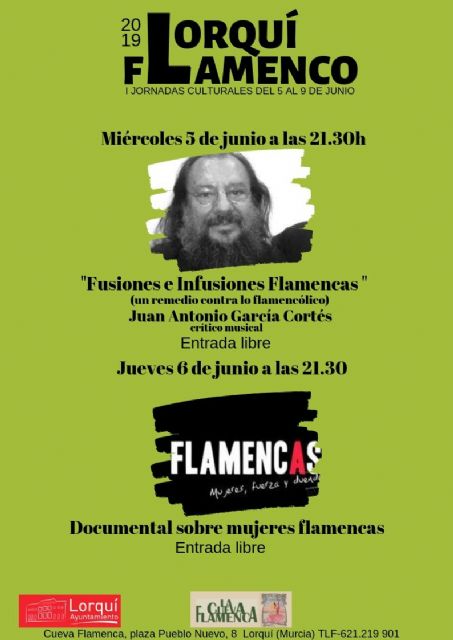 Las citas comienzan el miércoles día 5 con una charla 'Fusiones e Infusiones Flamencas' a cargo del crítico musical y periodista Juan Antonio García Cortés, a las 21.30 horas en la Cueva Flamenca y con entrada libre. El día 6 se proyectará un documental sobre mujeres flamencas en la misma ubicación y hora, también con entrada libre.