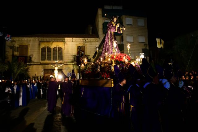 Ante la atenta mirada de vecinos y visitantes -unas 3.500 personas llegadas de otros puntos de la Región- el Nazareno de Lorquí, único del maestro escultor Francisco Sazillo en la Región de Murcia, realizó al filo de la medianoche la tradicional Bendición a los cuatro puntos cardinales, al término de la Procesión del Calvario.