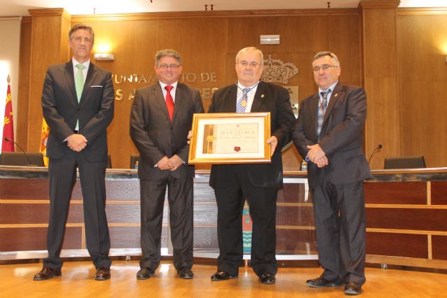 Al finalizar las intervenciones, el concejal de Presidencia ha entregado el Diploma de Cronista Oficial a Pablo Galindo, el presidente de la Asociación de Cronistas, le ha hecho entrega de un pin y el alcalde de Los Alcázares, Anastasio Bastida, le ha impuesto la medalla municipal de Cronista Oficial.