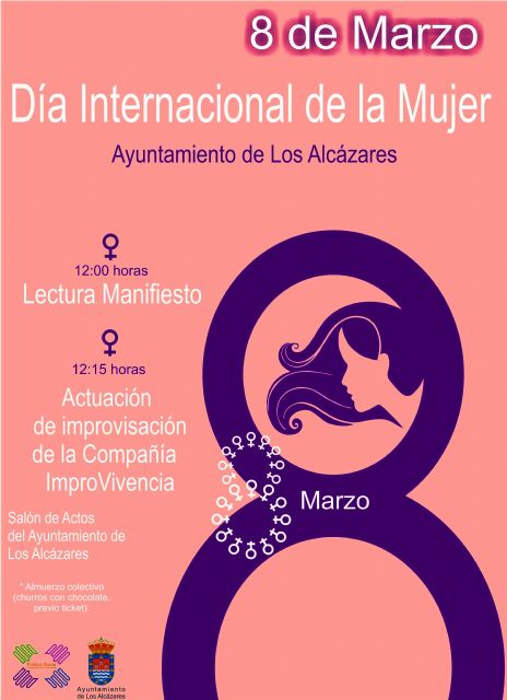 La Concejalía de Política Social del Ayuntamiento de Los Alcázares celebra el Día de la Mujer con una semana de actividades que comenzarán mañana a las 12 horas con la lectura del manifiesto en el Salón de Actos de la Casa Consistorial y una actuación de improvisación a cargo de la compañía " ImproVivencia".