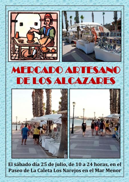 Mañana sábado, día 25 de julio, organizado por la concejalía de Comercio del ayuntamiento de Los Alcázares y el Gremio Regional de Artesanías Varias, Presentan de nuevo este mes de julio de 10 a 24 horas, en el Paseo de La Caleta el tradicional "Mercado Artesano de Los Alcázares, en esta temporada estival llevaremos nuestra artesanía a la orilla del Mar Menor, para que todos los vecinos y veraneantes puedan disfrutar de nuestra mejor artesanía regional que sale al encuentro de todos a la costa de Los Alcázares, para que disfruten de los trabajos hechos por nuestros artesanos realizados a mano, pero poniendo todo su saber y además de corazón para todos propios y foráneos que visitan esta localidad de nuestra Costa Cálida.