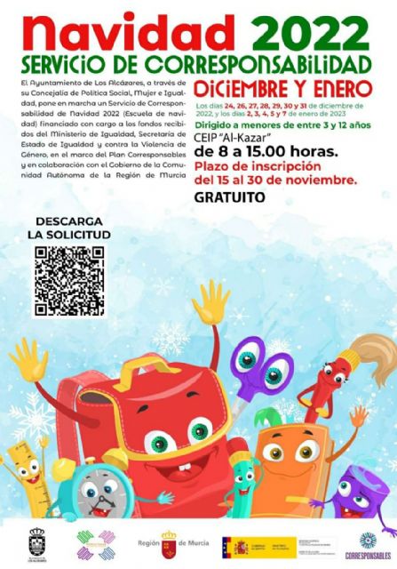 Este servicio de Escuela de Navidad gratuita se pone en marcha gracias a los fondos recibidos del Ministerio de Igualdad, Secretaría de Estado de Igualdad y contra la Violencia de Género, en el marco del Plan Corresponsabilidad y en colaboración con el Gobierno de la Comunidad Autónoma de la Región de Murcia.