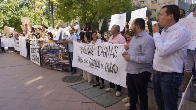 "Hemos venido hasta aquí después de pedir estas soluciones de forma reiterada desde hace años sin recibir respuesta. Hoy, representantes de todas las AMPAS del municipio, con el firme apoyo del Ayuntamiento de Los Alcázares, han presentado en la consejería más de 1.200 firmas apoyando esta reivindicación histórica, justificada y más que legítima", explica la concejal de Educación Jose Lajara, que se ha unido a la concentración junto al alcalde de Los Alcázares, Mario Pérez Cervera, y otros miembros de la corporación municipal.