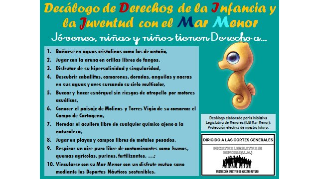 En la celebración de los sesenta y dos años de la Declaración de los Derechos del Niños, la plataforma Iniciativa Legislativa de Menores (ILM Mar Menor) publica el "Decálogo de Derechos de la Infancia y la Juventud con el Mar Menor", en la que se evoca el Mar Menor ideal que vivieron nuestros antepasados y que se quiere recuperar para las generaciones actuales y venideras.