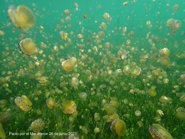 Pacto por el Mar Menor ha enviado un correo al consejero de Medio Ambiente, al director del IEO y al portavoz del Comité Científico, en el que piden una comunicación, redactada en un lenguaje sencillo, dirigida a la población en general en la que se explique la explosión de medusas (Cotylorhiza tuberculata) en el Mar Menor durante esta última semana de junio, así como sobre la mancha blanquecina frente a la desembocadura de la rambla del Albujón.