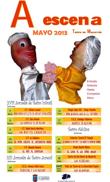 Llega el mes de mayo, y con él, el teatro se apodera de la Universidad Popular de Mazarrón (UPM) donde durante todo el citado mes tendrán lugar el programa "A escena" compuesto por las XVIII Jornadas de Teatro Infantil, las XIII Jornadas de Teatro Juvenil y varias representaciones dirigidas también a los adultos del municipio. Precisamente, el programa de Teatro Adulto da el pistoletazo de salida a este programa con las obras "La consulta de don Tony" y "Los amores de Gerineldo Tenorio", representaciones a cargo del colectivo teatral "El Talayón" que tendrán lugar este sábado 4 de mayo a partir de las 22 horas en el salón de actos de la UPM.