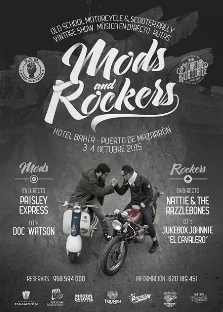Este sábado 3 y domingo 4 de octubre vuelve a Mazarrón “Mods and rockers”, concentración motera de ámbito nacional que atrae a numerosos seguidores de unos movimientos juveniles surgidos en los años 80 e inspirados en dos estilos musicales y estéticos opuestos propios de la década de los 60, escenificados en torno al tipo de vehículo de locomoción empleado. Desde hace tres años, la asociación cultural Motorkulture lleva tres años organizando en Mazarrón un encuentro muy popular que vuelve a repetir en 2015, esta vez utilizando el Hotel Bahía como centro de operaciones.