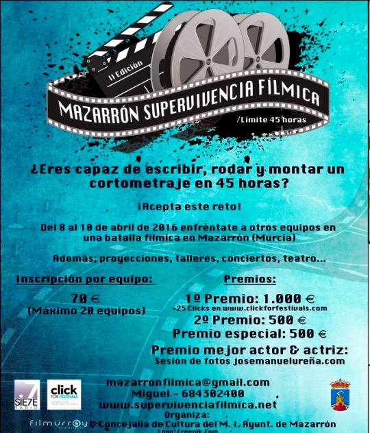 El certamen comenzará el viernes 8 de abril con la recepción de los grupos participantes. La inscripción se puede realizar en www.supervivenciafilmica.net. El precio es de 70 euros para grupos de un máximo de 20 personas. Tras la recepción, se realizará el sorteo de un género cinematográfico, de una localización del municipio y de un elemento sorpresa que deberán incluir en la realización del cortometraje. A partir de ahí tendrán 45 horas hasta presentar el trabajo final el domingo 10 de abril. El certamen contempla tres premios en metálico. El corto ganador obtendrá un premio de 1.000 euros y habrá un segundo premio de 500 euros y otro premio especial de 500 euros en el que se valorará el mejor uso de una localización del municipio. Se reconocerá también, este año como novedad, al mejor actor y mejor actriz del certamen.