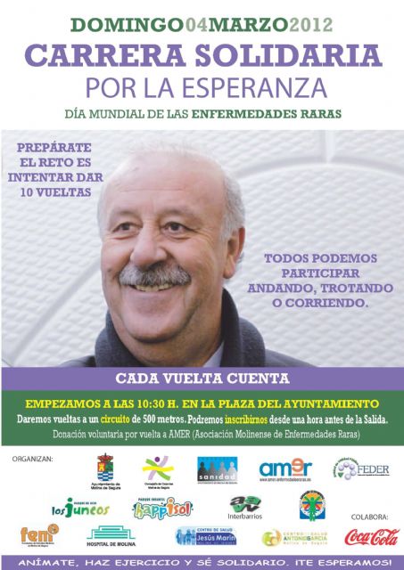Uno de los actos más destacados, que dará comienzo a las 10.30 horas, con salida desde la Plaza del Ayuntamiento, es la I Carrera Solidaria por la Esperanza, sobre un circuito de 500 metros al que se podrán dar vueltas andando, trotando o corriendo, durante 1 hora. Se pide a los ciudadanos que muestren su solidaridad haciendo ejercicio físico. La carrera se puede hacer de forma individual o participando para algún colectivo. Así, habrá 6 categorías: centro sanitario más solidario; asociación de vecinos más solidaria; asociación socio/sanitaria más solidaria; asociación de mujeres más solidaria; asociación de personas mayores más solidaria; y club deportivo más solidario. Todos los participantes podrán realizar una aportación voluntaria para la Asociación Molinense de Enfermedades Raras (AMER), y recibirán un diploma.