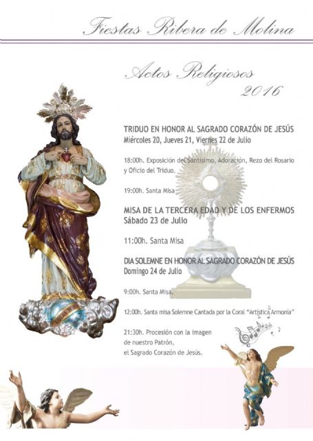 Las Fiestas Patronales de la pedanía de La Ribera de Molina, en honor al Sagrado Corazón de Jesús, se celebran desde el viernes 15 de julio hasta el lunes 25 de julio. Entre los actos programados, destacan las actuaciones de Los Parrandboleros, el viernes 22 de julio, y El Show de La Pandilla de Drilo, el miércoles 20 de julio. Por su parte, el pregón de fiestas correrá a cargo de Antonio López Meseguer, El Piche, y se celebrará el viernes 22 de julio, a las 22.30 horas.